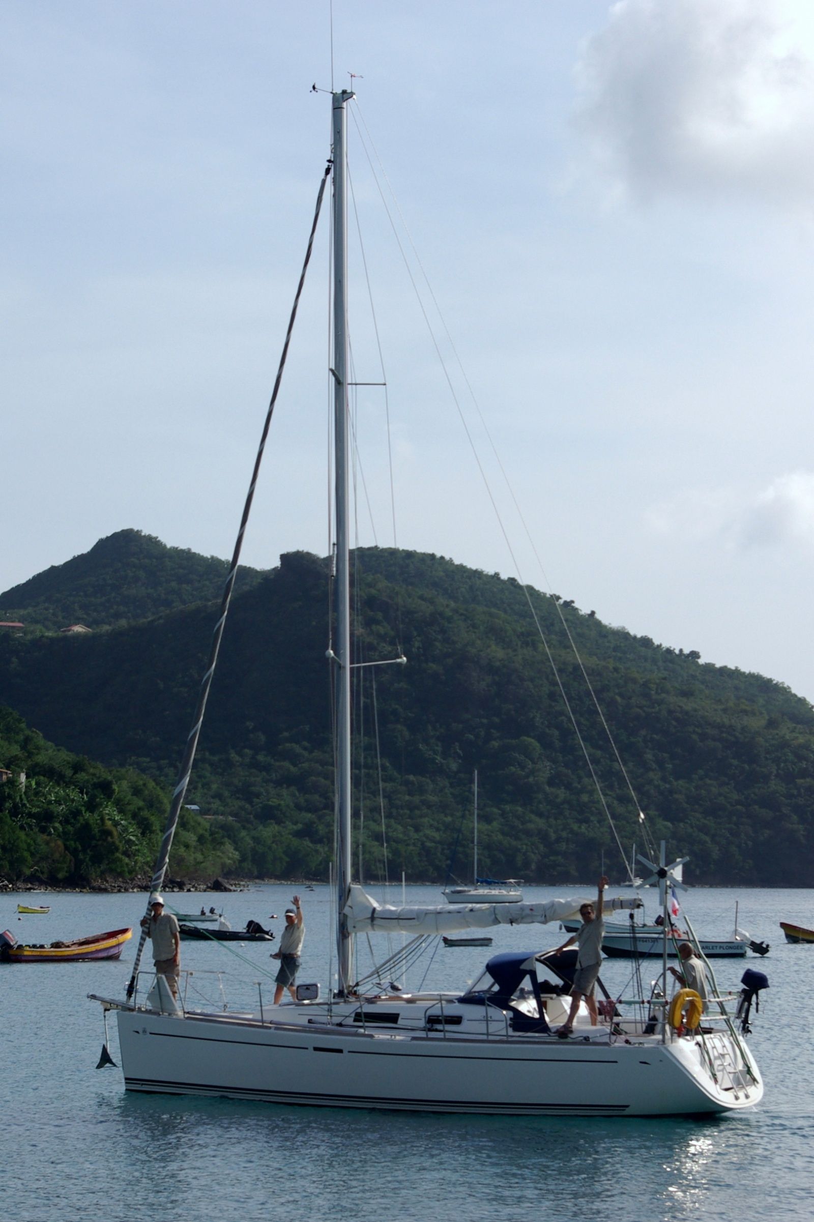 Pendant 23 jours, ils ont connu la houle, le temps très variable, de forts coups de vent, le soleil, les grains, mais aussi le bonheur de se retrouver au beau milieu de l’océan, à des milliers de kilomètres de leur vie de tous les jours et de ses préoccupations. Une traversée qu’ils ont très bien vécue, dans une ambiance de franche camaraderie : « nous n’avons jamais eu de doutes sur l’entente qui règnerait à bord » confie Arnaud, « nous nous connaissons si bien que ça coulait de source ! ». Une ambiance qui a été par 3 fois, au moins, inoubliable : les 4 marins avaient emporté du champagne et du fois gras, pour fêter 3 évènements : Noël et le 31 décembre bien sûr, mais aussi l’anniversaire de Vincent, qui aura eu 32 ans au milieu de nulle part. Un jeune homme dont tous ont apprécié les talents de chef sur le bateau… Au matin du 1er janvier, les amis aventuriers ont enfin aperçu la terre de Martinique ! Ils arrivaient au bout de leur rêve, avec un sentiment mêlé de joie et de regrets. Ce fut un moment d’émotions pour les 4 hommes lorsqu’ils ont, enfin, mis le pied sur la terre ferme. On pourrait donc penser que leur aventure à pris fin sur un ponton du Marin…pas tout à fait. Il leur restait encore un trajet à accomplir, afin de boucler vraiment leur périple : ils avaient décidé de terminer leur voyage aux Anses d’Arlet, une commune qui, pour eux, « représente vraiment le rêve martiniquais … ». | |||||||